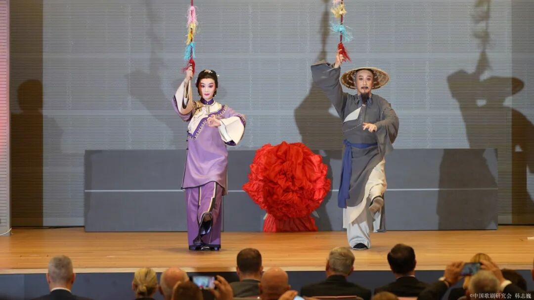 在国歌奏响与致辞环节之后,扬剧表演作为晚会的文化亮点登场。这是扬州扬剧研究所首次将这一古老剧种带到克罗地亚舞台,为当地观众打开了一扇领略中国戏曲魅力的窗口。演出以“淮扬声韵·几许风雅”为主题,精选了扬剧经典剧目的四个片段,既展示了扬剧的艺术精髓,也便于克罗地亚观众在有限时间内领略其独特风采。