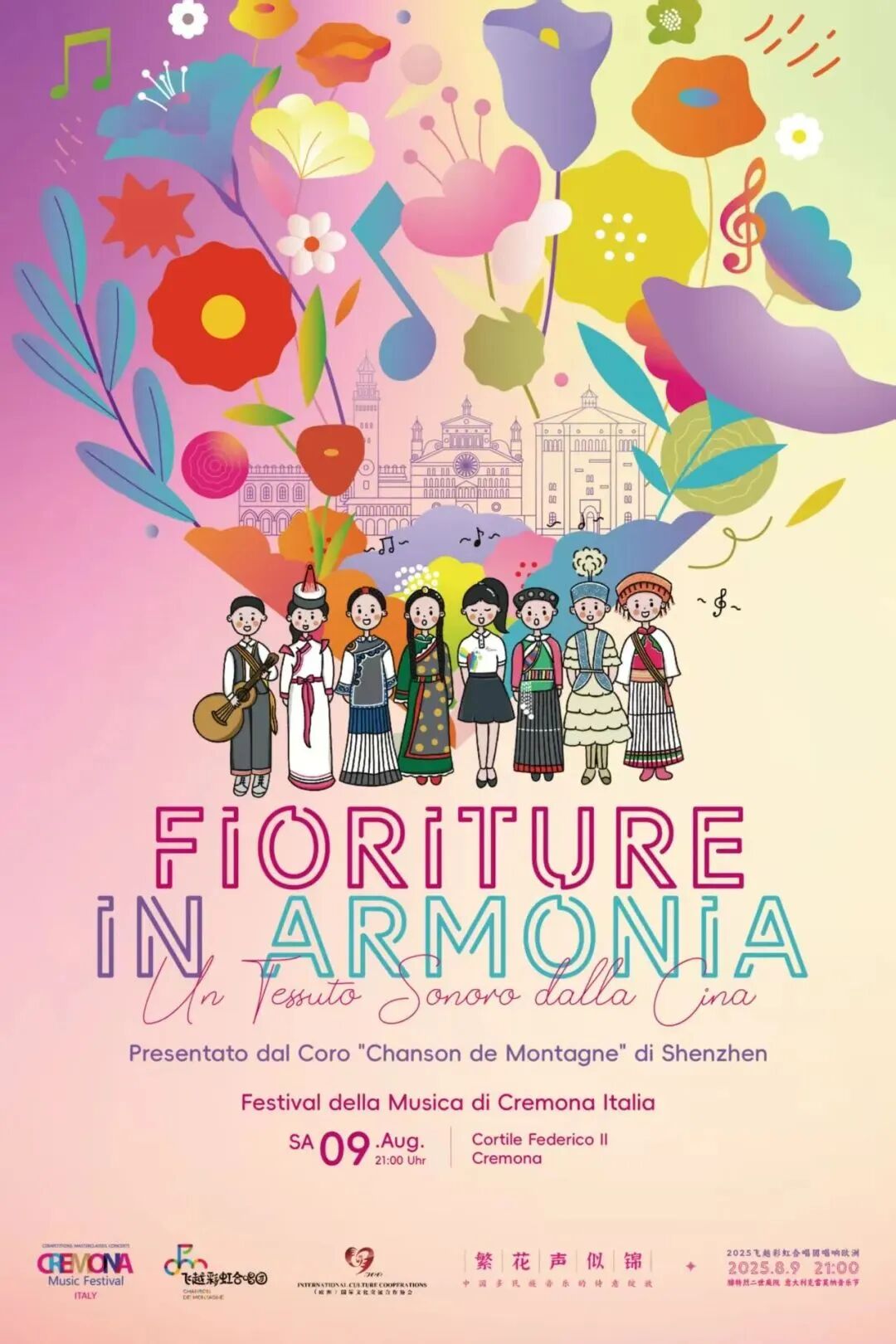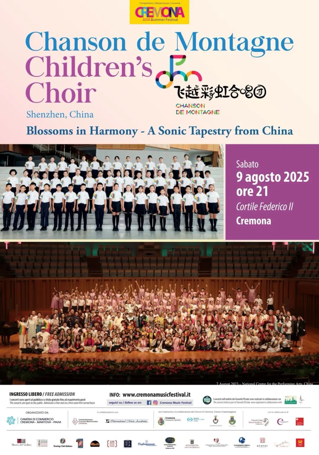 8月9日,在意大利克雷莫纳国际夏季音乐节的大力支持下,合唱团在这座以制琴闻名的音乐古城,参加了“欧洲国际艺术周”第二项重要合作活动–“2025克雷莫纳国际夏季音乐节”之“繁花声似锦”飞越彩虹童声合唱团专场音乐会。